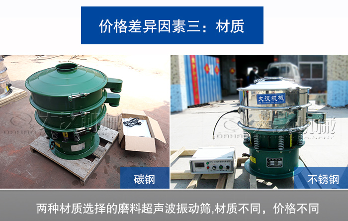 超聲波振動(dòng)篩材質(zhì)有不銹鋼和碳鋼兩種,碳鋼超聲波振動(dòng)篩價(jià)格便宜、熱處理和機(jī)械性能好,雖然它適用的行業(yè)有很多,但是它的材質(zhì)具有一定的腐蝕性,所以對(duì)于磨料行業(yè)的用戶來(lái)說(shuō)還是要慎重選擇。