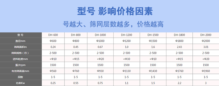 葵花籽不銹鋼振動(dòng)篩型號(hào)有DH400型、DH600型、DH800型、DH1000型、DH1200型、DH1500型、DH1800型、DH2000型。不同大小的型號(hào)所配備篩網(wǎng)層數(shù)也不同(可達(dá)到五層),型號(hào)越大篩網(wǎng)層數(shù)越多價(jià)格越高。