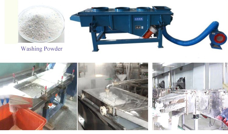 大漢機(jī)械降溫直線振動篩這對高溫特性物料設(shè)計(jì)研發(fā),可在有效降低物料溫度后再對物料進(jìn)行篩分,有效的提高了篩分效率及處理量,下面以洗衣粉為例說明風(fēng)冷式振動篩的應(yīng)用。洗衣粉在剛剛完成生產(chǎn)后,通常為120度左右的高溫,如不進(jìn)行降溫處理,篩選分級非常困難,而洗衣服不適合傳統(tǒng)的水冷式降溫。在洗衣粉生產(chǎn)線上用“大漢牌”風(fēng)冷式直線振動篩,剛生產(chǎn)完成120度高溫洗衣粉通過輸送設(shè)備直接進(jìn)入風(fēng)冷式直線振動篩,經(jīng)過安裝在設(shè)備進(jìn)料口底部的風(fēng)機(jī)降溫冷卻系統(tǒng),(不符合要求的結(jié)塊物料通過安裝在進(jìn)料口端的篩網(wǎng)篩選后從出料口旁的小型排料口排出,見下圖,該裝置可根據(jù)物料特性選裝),可直接將洗衣粉溫度降至40-50度后再進(jìn)入直線振動篩完成篩選分級工作。