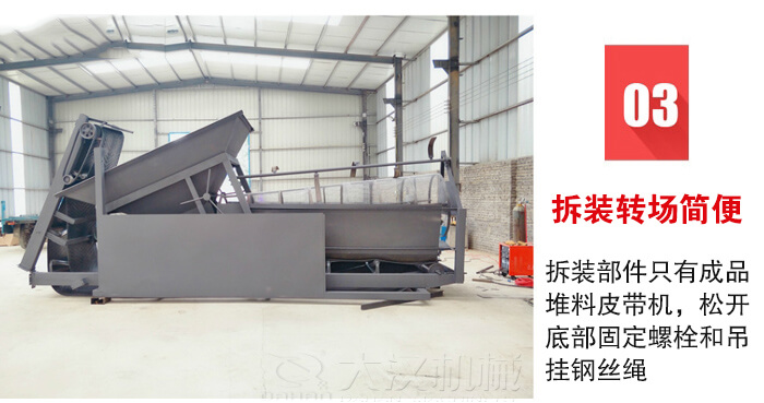 設(shè)備的高度整體性便于施工現(xiàn)場存放或轉(zhuǎn)場運(yùn)輸,拆裝部件只有成品堆料皮帶機(jī),松開底部固定螺栓和吊掛鋼絲繩,將成品皮帶機(jī)塞入主框架底面即可。