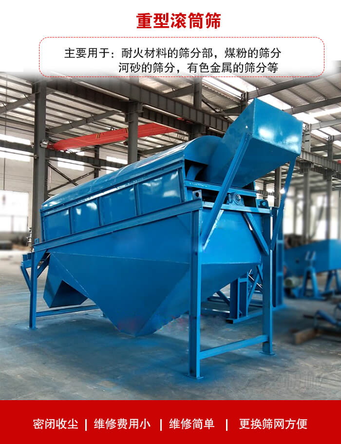 重型滾筒篩主要用于:耐火材料的篩分部,煤粉的篩分,河砂的篩分,有色金屬的篩分等。具有密閉收塵,維修費(fèi)用小,維修簡(jiǎn)單,更換篩網(wǎng)方便等特點(diǎn)根據(jù)不同用戶的篩分需求選擇:?jiǎn)螌訚L筒篩:主要分離出兩種粒度的物料。多層滾筒篩以及單層多段滾筒篩:可分離多種粒度的物料。