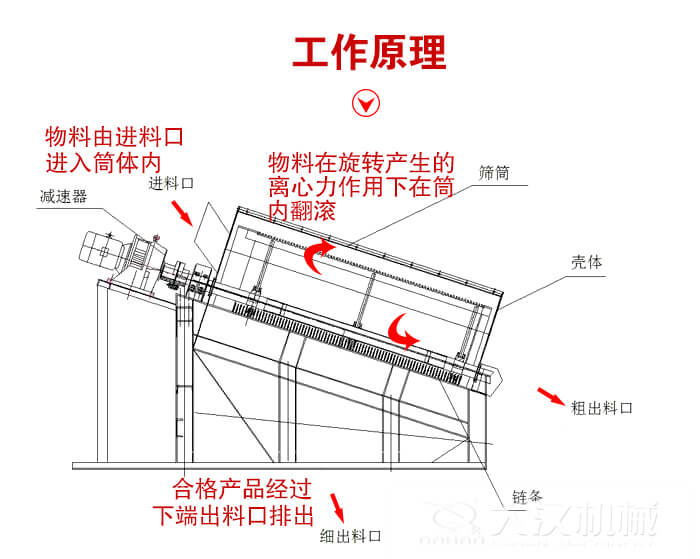 電機(jī)驅(qū)動(dòng)滾筒軸線作旋轉(zhuǎn)運(yùn)動(dòng),減速機(jī)調(diào)節(jié)筒體以一定的轉(zhuǎn)速旋轉(zhuǎn),物料由進(jìn)料口進(jìn)入筒體內(nèi),在旋轉(zhuǎn)產(chǎn)生的離心力作用下,物料在筒內(nèi)翻滾,自上而下通過分級(jí)篩網(wǎng)析出,由于篩網(wǎng)分級(jí)尺寸不同,物料逐漸被分離篩選,粒度合格的物料經(jīng)篩分后落入到各自的漏斗,然后由人力方式運(yùn)出或通過輸送機(jī)自流送往成品站。合格產(chǎn)品經(jīng)過下端出料口排出,顆粒較大,分選不合格的產(chǎn)品經(jīng)另一排料口排出,筒內(nèi)清理裝置,使篩網(wǎng)不宜被阻塞。