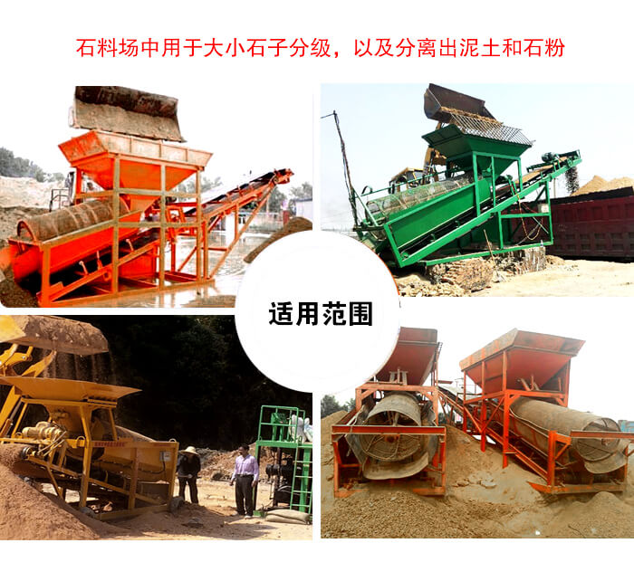 滾筒篩土同時對物料的適應能力強,粘性、濕度大、臟、雜等各種性質的物料都能篩分。石料場中用于大小石子分級,以及分離出泥土和石粉。化工選礦行業(yè)用于大小塊狀物分級及分離粉狀物質。