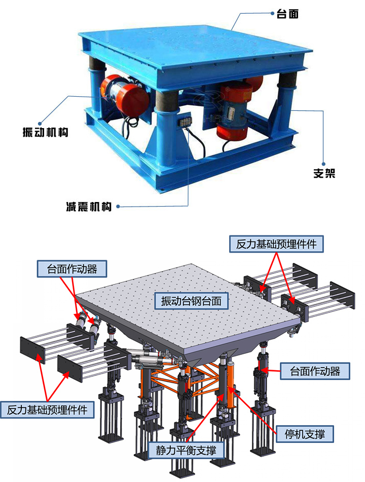 振動平臺主要有支架、臺面、振動機構(gòu),減震機構(gòu)四部分組成。