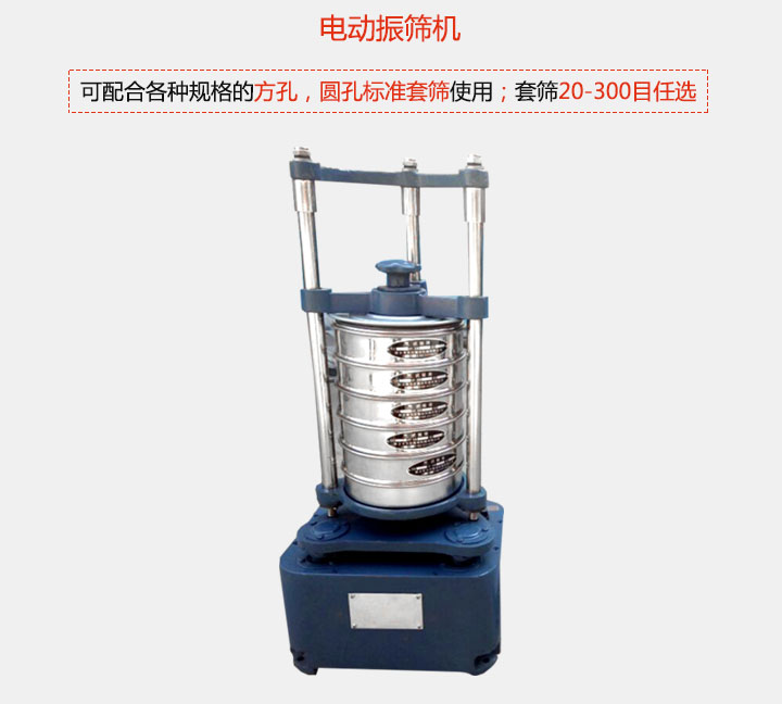 產(chǎn)品簡介:電動振篩機是實驗室中比較常用的篩分設(shè)備,該機可以配合各種規(guī)格的方孔,圓孔標(biāo)準套篩進行使用,套篩從20-300目任選。