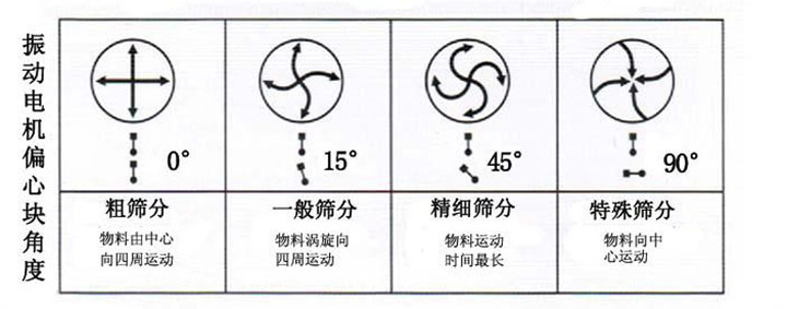 當(dāng)上下偏心塊調(diào)至15度時(shí),物料呈漩渦狀分散,用來(lái)篩分一般物料。