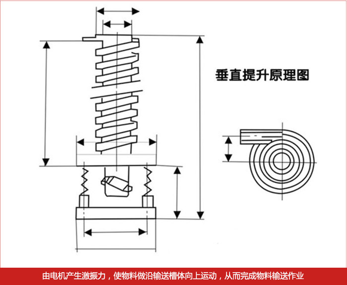 螺旋垂直振動(dòng)提升機(jī)DZC系列垂直振動(dòng)輸送機(jī)的驅(qū)動(dòng)裝置振動(dòng)電機(jī)安裝在輸送塔下部,兩臺(tái)振動(dòng)電機(jī)對(duì)稱(chēng)交叉安裝,輸送塔由管體和焊接在管體周?chē)穆菪斔筒劢M成,輸送塔座于減振裝置上,減振裝置由底座和隔振彈簧組成。當(dāng)垂直輸送機(jī)工作時(shí),根據(jù)雙振動(dòng)電機(jī)自同步原理,由振動(dòng)電機(jī)產(chǎn)生激振力,強(qiáng)迫整個(gè)輸送塔體作水平圓運(yùn)動(dòng)和向上垂直運(yùn)動(dòng)的空間復(fù)合振動(dòng),螺旋槽內(nèi)的物料則受輸送槽的作用,作勻速拋擲圓運(yùn)動(dòng),沿輸送槽體向上運(yùn)動(dòng),從而完成物料的向上(或向下)輸送作業(yè)。